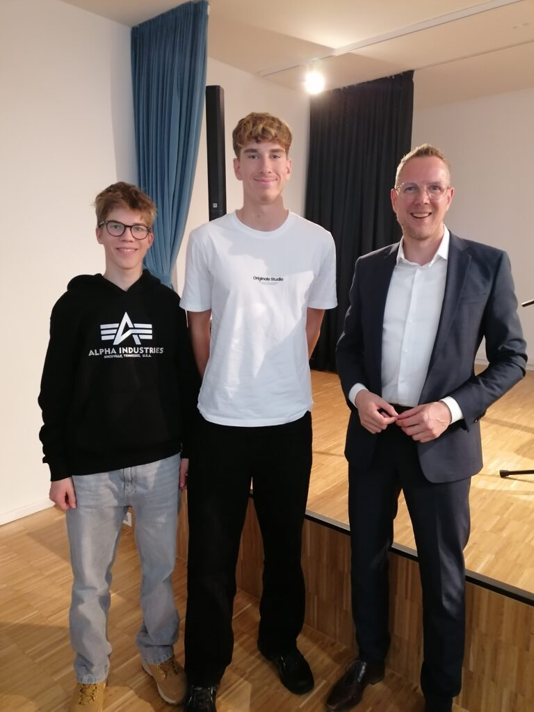 Kürzlich waren unsere frisch gewählten Schulsprecher Max und Henry zu einer interessanten Veranstaltung mit dem Staatssekretär des Hessischen Ministeriums für Wissenschaft, Forschung, Kunst und Kultur, Herrn Christoph Degen, eingeladen. Anlässlich des Themenabends zum Thema „Demokratieforschung in Hessen“ durften unsere Schulsprecher vor einem 80-köpfigen Publikum über die demokratischen Mitwirkungsmöglichkeiten der Schülerschaft an der Stadtschule berichten. Neben der Gremienarbeit in der Schülervertretung (SV) und der Mitwirkung in der Schulkonferenz oder dem Kreisschülerrat berichteten die beiden vor allem über die konkreten Mitgestaltungsmöglichkeiten der Schüler bei der Schulentwicklung und im Unterricht der Stadtschule. Exemplarisch hierfür wurde die schülerzentrierte Projektarbeit während der Lernzeit oder im Fächerverbund „Leben und Gestalten“ vorgestellt oder der gemeinsame Austausch zwischen Schülern, Lehrern und Eltern über individuelle Leistungen und Zielsetzungen in Lernentwicklungsgesprächen auf Augenhöhe sowie durch alternative Bewertungsmethoden. Auch die kreative Arbeit in unseren Themenklassen sowie die tollen Impulse durch die Arbeit im Fliegenden Künstlerzimmer, bei denen die Schüler ihre eigenen Ideen und Wünsche kreativ umsetzen können, wurden vorgestellt.
