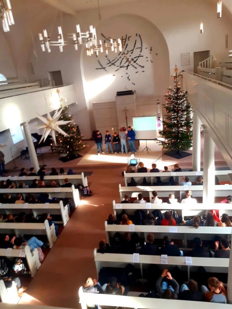 Gestaltet wurde der Gottesdienst von zwei 8er Religionskursen, gemeinsam mit ihren Religionslehrkräften: ein selbstgedrehtes Video zur Weihnachtsgeschichte, Weihnachtsworte in verschiedenen Sprachen von der Klasse 9b, Fürbitten der Klasse 5f, eine Lieddarbietung von der Musical-AG, gemeinsames Singen mit Orgel und ein starker, verbindender Moment: das Weitergeben des Lichts durch Kerzen von Reihe zu Reihe.